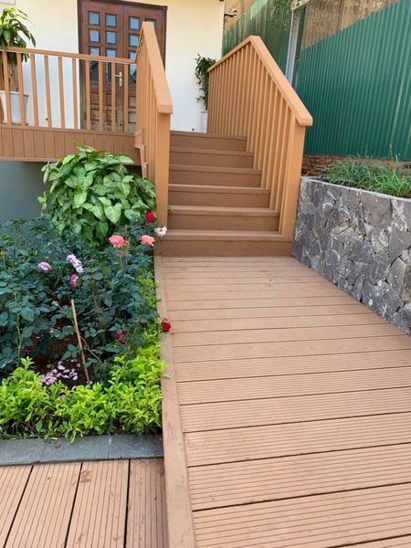 Sàn gỗ ngoài trời lõi rỗng, màu vàng gỗ với thiết kế hai mặt ma sát tốt giúp chống trơn trượt trong quá trình sử dụng, một mặt thiết kế với một mặt vân gỗ và một mặt vân sọc, dễ dàng tùy ý sử dụng theo sở thích hoặc mẫu thiết kế thích hợp.